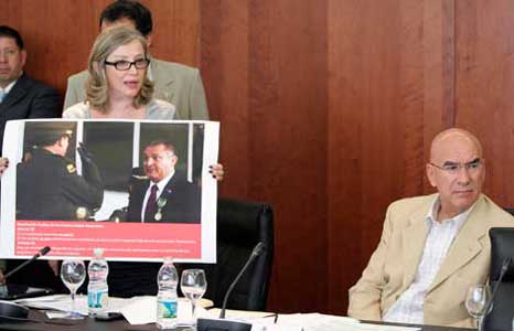 En comisiones, la Permanente rechazó analizar la solicitud del presidente Felipe Calderón para que el órgano legislativo autorizara a Genaro García Luna aceptar una medalla de la Policía Nacional de Colombia, por considerar que se trata de un hecho consumado, toda vez que el funcionario ya recibió la presea. Los señalamientos son que el secretario violó la Constitución al no tener el aval del Congreso para aceptar el reconocimiento. La petista Laura Itzel Castillo mostró una imagen de cuando se entregó la distinción, y pidió la remoción del titular de la SSP Foto La Jornada