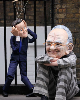 Un británico, disfrazado con una cabeza gigante de Rupert Murdoch y con una marioneta que representa al premier David Cameron, se manifestó en Londres frente a la residencia del magnate de los medios de comunicación. Este último, de manera sorpresiva, retiró su oferta para comprar por 12 mil 500 millones de dólares BSkyB, la principal televisora británica privada, ante el escándalo que se desató por las escuchas telefónicas ilegales que realizaba el dominical News of the World, propiedad del empresario Foto Reuters
