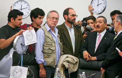 Entre empujones con elementos de seguridad de la nueva sede del Senado, el poeta Javier Sicilia y jóvenes del movimiento twitero que propugnan esos cambios arrancaron a legisladores de PRI, PAN y PRD el compromiso de que el 28 de julio próximo habrá dictamen sobre la minuta de reforma política. Dejen de darnos atole con el dedo y no hagan más tácticas dilatorias, demandó el escritor. Los manifestantes pidieron candidaturas independientes, relección de alcaldes y diputados, consulta popular e iniciativa ciudadana Foto José Antonio López