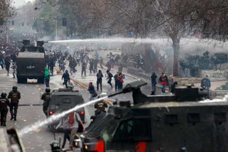 escuche la voz del pueblo. En Santiago y otras ciudades del país andino se realizaron marchas masivas. En las movilizaciones se demandó una nueva Constitución, cambios en el código laboral y una redistribución drástica en los impuestos. Como en la jornada precedente, hubo enfrentamientos entre manifestantes y policías, quienes utilizaron carros antidisturbios. El saldo global fue de 465 detenidos y 78 heridos Foto Reuters