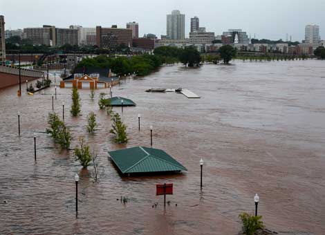 El centro de Nuevo Brunswick, Nueva Jersey, se puede observar desde el desbordado río Raritan, tras el paso del huracán Irene. El gobernador Chris Christie estimó que los daños ascenderán a miles de millones de dólares en toda la costa atlántica Foto Ap