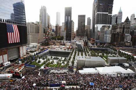 Miles familiares de las víctimas en las Torres Gemelas participaron en Nueva York en la ceremonia de conmemoración del décimo aniversario de los ataques del 11 de septiembre. Las medidas de seguridad en ese espacio fueron extremas, tanto que el presidente Barack Obama y el ex presidente George W. Bush, con sus respectivas esposas, fueron colocados detrás de un cristal blindado. En la llamada zona cero se inauguró el Monumento del 11-S, que incluye dos fuentes en las