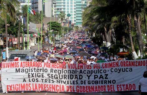 Unas 4 mil personas, la mayoría profesores, participaron en la caminata por la Costera Miguel Alemán, convocada por el magisterio guerrerense para protestar contra la inseguridad pública y exigir soluciones para que se abata la violencia en el estado. Horas más tarde, el gobernador Ángel Aguirre Rivero manifestó que comparte la preocupación de docentes y estará cerca de ellos. Celebró que los maestros hayan decidido retornar a las aulas el próximo lunes Foto Javier Verdín
