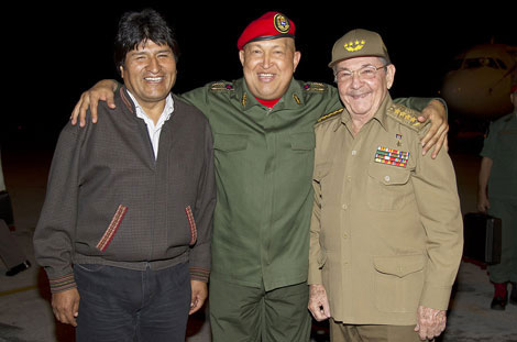 El presidente cubano Raúl Castro recibió en el aeropuerto internacional José Martí a sus homólogos de Bolivia, Evo Morales, y de Venezuela, Hugo Chávez. El mandatario indígena recibirá hoy un doctorado honoris causa y luego partirá hacia Nueva York para participar en la Asamblea General de la Organización de Naciones Unidas, mientras Chávez recibirá en la isla su cuarto tratamiento de quimioterapia. En Caracas se mostró optimista sobre su salud: lo más probable es que sea el último y ya cerramos la página. Adiós amenaza de cáncer Foto Xinhua