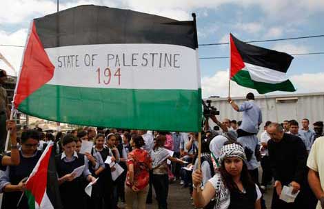 Decenas de personas se manifestaron en Ramalá en apoyo a la petición que hará el viernes el presidente Mahmoud Abbas ante la Asamblea General de la Organización de Naciones Unidas para que se dé reconocimiento al Estado palestino. El primer ministro israelí, Benjamin Netanyahu, quien se opone a esa postura, propuso reanudar negociaciones, lo cual fue rechazado por Abbas, quien puso como condición que Tel Aviv reconozca las fronteras de 1967 y frene la construcción de asentamientos judíos en territorios ocupados Foto Ap