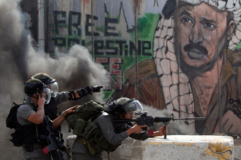 Fuerzas israelíes se enfrentan con manifestantes palestinos cerca del puesto fronterizo de Qalandiya. Decenas de miles salieron ayer a las calles de las principales ciudades de Cisjordania para respaldar la solicitud de reconocimiento del Estado palestino como miembro pleno de la Organización de Naciones Unidas, que el presidente de la ANP, Mahmoud Abbas, ofreció presentar este viernes ante el organismo internacional Foto Reuters