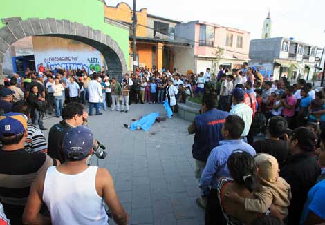 En la explanada principal del poblado de Nexquipayac, en el municipio de San Salvador Atenco, estado de México, quedó tendido el cadáver de uno de los cuatro presuntos asaltantes que fueron golpeados por cientos de personas. Algunos colonos señalaron que ya están cansados de sufrir constantes atracos, tanto en unidades de transporte como en sus viviendas Foto Jesús Villaseca