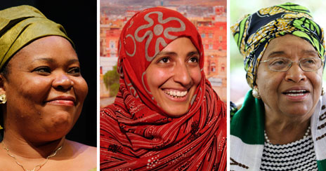 Las liberianas Leymah Gbowee y Ellen Johnson-Sirleaf, y la yemení Tawakkul Karman (al centro), que libraron campañas contra la guerra y la opresión, fueron galardonadas con el Premio Nobel de la Paz, en una decisión que buscó destacar el papel femenino en el activismo por el fin de la violencia. Amnistía Internacional señaló que es un importante paso para el reconocimiento de la lucha de la mujer por la igualdad Foto Reuters