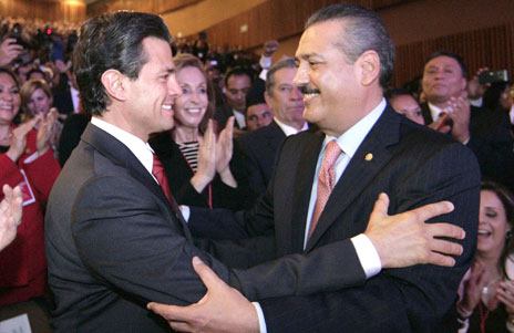 El Consejo Político Nacional del PRI decidió ayer que la selección de su candidato presidencial saldrá de una consulta abierta y directa entres sus militantes y simpatizantes. En el cónclave priísta, Manlio Fabio Beltrones acudió a saludar a Enrique Peña Nieto Foto Notimex