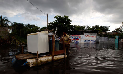 Cinco colonias ubicadas en la periferia de la capital tabasqueña resultaron anegadas tras el rompimiento de unos 100 metros del muro de contención del río Viejo Mezcalapa; cientos de familias fueron desalojadas. El presidente Felipe Calderón y el gobernador Andrés Granier realizaron ayer un recorrido por las zonas afectadas del estado. Mientras el Ejecutivo federal habló de 120 mil damnificados, el mandatario priísta dijo que eran más de 200 mil. Este último se quejó de que Gobernación declaró la emergencia en sólo 12 de los 17 municipios dañados Foto Alfredo Domínguez
