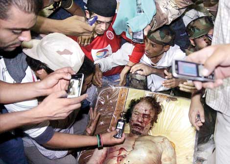 Residentes de Sirte, la ciudad natal de Muammar Kadafi, toman fotografías del cadáver del líder libio. Mahmud Jibril, jefe ejecutivo del Consejo Nacional de Transición, dijo que el coronel fue sacado de un túnel de alcantarillado sin ofrecer resistencia. Cuando lo trasladábamos hacia una camioneta recibió un balazo en el brazo derecho. Luego el vehículo quedó atrapado en un enfrentamiento entre los revolucionarios y las fuerzas oficiales, y recibió un tiro en la cabeza. También se difundió que fue un combatiente el responsable del disparo que quitó la vida a Kadafi Foto Xinhua/ Notimex