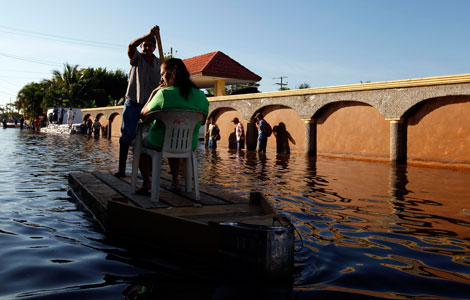 La inundación en la colonia Las Torres (en la imagen), en Villahermosa, lleva más de una semana. Los pobladores han colocado costales de arena para tratar de mitigar la situación. En Nacajuca, el desbordamiento del río Samaria mantiene en zozobra a las comunidades indígenas chontales, que además padecen la falta de apoyo oficial. Viviendas, escuelas, templos, sembradíos y potreros permanecen bajo las aguas, pese a que ayer se cumplieron cinco días sin lluvias en la entidad Foto Alfredo Domínguez