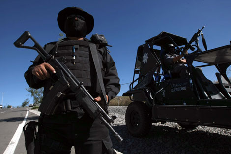 Policías estatales vigilan los accesos al recinto donde se realiza el encuentro, en la ciudad de Querétaro. En el acto de inauguración,Miguel Alemán Velasco, presidente del comité organizador, hizo un llamado a empresarios, políticos y académicos a generar ideas y acciones que impulsen el desarrollo y bienestar del país y permitan cerrar la brecha que existe con las naciones avanzadas Foto Marco Peláez