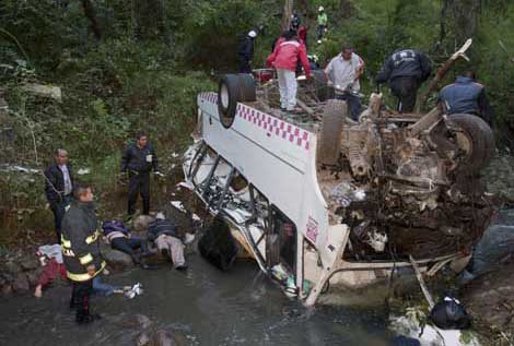 Más de tres horas duró el rescate de las víctimas a la altura del paraje Peña de Venados, en la carretera Naucalpan-Huixquilucan. Además de las personas fallecidas, 20 resultaron heridas, cinco de gravedad. El accidente ocurrió a las ocho horas de ayer y, según versiones, al parecer fue un intento de rebase de la unidad, la cual se dirigía al Toreo de Cuatro Caminos Foto Agencia MVT