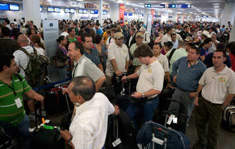 El aeropuerto de Cancún se vio saturado por cientos de turistas que intentan salir de Quintana Roo ante la amenaza del huracán Rina, que ayer pasó de categoría 2 a 1 en la escala Saffir-Simpson. Las autoridades de ese estado y de Yucatán desalojaron a 6 mil 600 personas que habitan en zonas de alto riesgo y ordenaron la suspensión de clases a partir de hoy. El meteoro se localizaba anoche a 225 kilómetros de Cozumel y a 190 kilómetros de Chetumal, con vientos sostenidos de 140 kilómetros por hora Foto Reuters