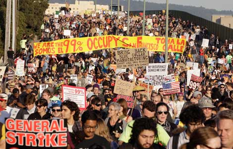 Miles de simpatizantes del movimiento Ocupa marcharon del centro de Oakland a la zona portuaria. Autoridades del lugar emitieron un comunicado en el que informaron que las operaciones estaban detenidas, lo que provocó el júbilo de los manifestantes. En una decisión sorpresiva, la alcaldesa Jean Quan dio el día a los trabajadores municipales para que se sumaran a la protesta Foto Ap