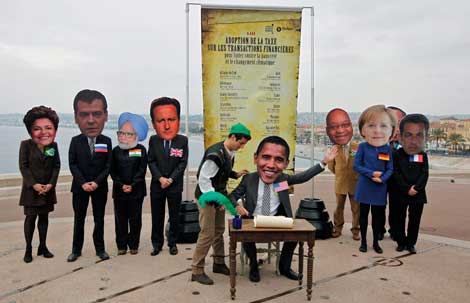 Activistas parodian en Niza la cumbre de gobernantes del Grupo de los 20, que comienza hoy en Cannes, Francia. Con máscaras de Dilma Rousseff (Brasil), Dimitri Medvediev (Rusia), Manmohan Singh (India), David Cameron (Gran Bretaña), Barack Obama (Estados Unidos), Jacob Zuma (Sudáfrica), Angela Merkel (Alemania) y Nicolas Sarkozy (Francia), repudiaron las fórmulas de los organismos financieros internacionales, las cuales, señalaron, han acentuado la crisis. Al final del encuentro, México recibirá la presidencia de la agrupación para 2012 Foto Reuters