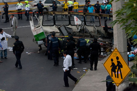 El choque de un microbús de la Ruta 1 –conducido con exceso de velocidad– contra una camioneta particular, en el kilómetro 19 de la carretera federal México- Cuernavaca, dejó un saldo de seis personas muertas y 20 lesionadas Foto Víctor Camacho