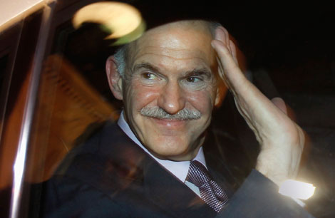 El primer ministro Giorgios Papandreou saluda al salir del encuentro con el presidente griego Karolos Papoulias y el líder de la oposición conservadora Antonis Samaras. En la reunión se abordó el plan de rescate de la Unión Europeo al país helénico y su posible aprobación antes de llamar a elecciones anticipadas. Lo que quedó claro es que Papandreou renunciará una vez formado un gobierno de coalición Foto Reuters