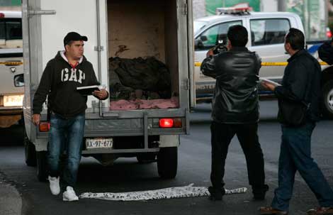 Empleados forenses dan cuentan de los cadáveres de 26 hombres hallados en tres camionetas cerca del paso a desnivel de los Arcos del Milenio, en Guadalajara. En uno de los vehículos se encontró un mensaje firmado por Los Zetas, en el que se atribuyen el crimen múltiple. El gobernador de Jalisco, Emilio González Márquez, quien no apareció en público, expresó, a través de su cuenta en redes sociales, que estaba consternado e indignado Foto Reuters
