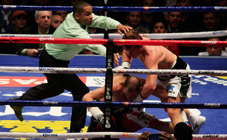 En la tercera defensa del cetro superwélter del Consejo Mundial de Boxeo, Saúl Álvarez venció al boricua Kermit Cintrón, luego de que el réferi detuvo el combate en el quinto asalto, debido a que el retador resultó lastimado por un potente derechazo del tapatío Foto Francisco Olvera