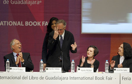 Al recibir el Premio FIL de Literatura en Lenguas Romances, el escritor Fernando Vallejo hizo un llamado a no acudir a las urnas. No te dejes engañar por los bribones de la democracia, expresó. Señaló que Calderón es un hombre indigno del puesto que ocupa, y denunció que éste y Fox dejaron impunes todos los delitos, el saqueo y el envilecimiento del PRI. Anunció que donará los 150 mil dólares de que está dotado el galardón. En la imagen el autor (de pie) es acompañado por el embajador de Alemania en México, Edmund Duckwitz; la premio Nobel de Literatura 2009, Herta Müller, y la titular del CNCA, Consuelo Sáizar Foto Notimex