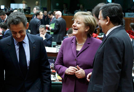 El mandatario francés, Nicolas Sarkozy; la canciller alemana, Angela Merkel, y el presidente de la Comisión Europea, José Manuel Barroso, celebran el pacto alcanzado ayer en Bruselas para tratar de salvar de la crisis a la región y su moneda. Gran Bretaña rechazó el acuerdo Foto Reuters