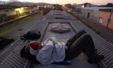 Cinco organizaciones defensoras de derechos humanos exigieron el cese del comisionado del Instituto Nacional de Migración, Salvador Beltrán del Río, a quien responsabilizan del violento desalojo de 250 desplazados guatemaltecos en el ejido tabasqueño de Nuevo Progreso. Demandaron que los 71 detenidos no sean repatriados, porque no hay garantías para ellos en su país. En la imagen, un centroamericano indocumentado espera en el techo de la llamada Bestia, en la estación de ferrocarril de Arriaga, Chiapas, la partida hacia la frontera con Estados Unidos Foto Reuters
