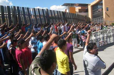 Acompañados de alumnos de la UNAM y del IPN, así como de comuneros de San Salvador Atenco e integrantes del Sindicato Mexicano de Electricistas, estudiantes de la Escuela Normal Rural de Ayotzinapa marcharon en Chilpancingo para demandar juicio político contra el gobernador Ángel Aguirre Rivero y castigo a los autores intelectuales y materiales del asesinato de Gabriel Echeverría y Jorge Herrera, hace un mes, durante el violento desalojo de la Autopista del Sol Foto Óscar Alvarado
