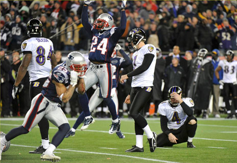 Nueva Inglaterra logró el gallardete de la Conferencia Americana al derrotar 23-20 a los Cuervos de Baltimores, quienes no pudieron concretar un gol de campo de 32 yardas (en la imagen), que hubiera empatado el encuentro cuando faltaban 11 segundos de juego. En la Conferencia Nacional, Nueva York venció 20-17 a San Francisco en tiempo extra, con anotación de tres puntos de Lawrence Tynes. Eli Manning y los Gigantes se enfrentarán a Tom Brady y sus Patriotas el 5 de febrero en Indianápolis Foto Reuters