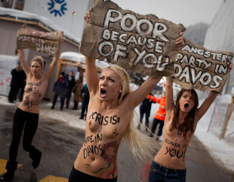 Dentro de las protestas contra la globalización en la ciudad de Davos, ayer tres ucranianas se manifestaron con el torso desnudo Foto Ap
