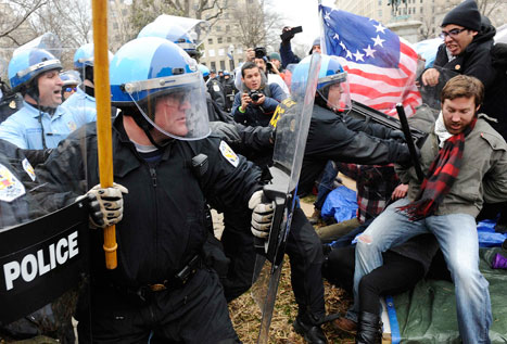Decenas de policías desmantelaron ayer el campamento de indignados en la céntrica plaza McPherson de la capital estadunidense. Durante el desalojo, los agentes arrestaron a seis manifestantes por resistirse a abandonar el lugar Foto Reuters