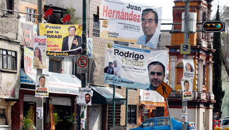La Procuraduría Ambiental y de Ordenamiento Territorial del gobierno capitalino informó, tras realizar un muestreo en más de 118 kilómetros de vialidades primarias y corredores publicitarios de las 16 delegaciones políticas, que 96 por ciento de la propaganda electoral está colocada en sitios no permitidos; la muestra fue de 6 mil 264 materiales, entre ellos carteles, mantas y pendones. La dependencia exhortó a los partidos políticos a que respeten las disposiciones jurídicas correspondientes. La imagen, en Calzada de los Misterios, en Gustavo A. Madero Foto Yazmín Ortega Cortés