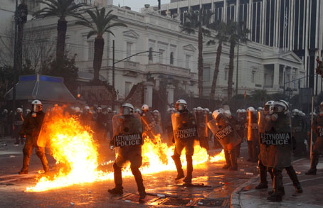 Bombas molotov fueron arrojadas contra la policía durante los disturbios en las inmediaciones del Parlamento griego, en el que ayer se aprobó un severo programa de austeridad para asegurar un segundo rescate financiero de la Unión Europea y del Fondo Monetario Internacional, así como una operación para eliminar una parte de la abultada deuda pública con acreedores privados. Se informó de 80 lesionados en los enfrentamientos Foto Reuters