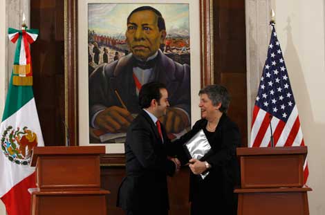 El secretario de Gobernación, Alejandro Poiré, y la secretaria de Seguridad Nacional de Estados Unidos, Janet Napolitano, durante la conferencia de prensa conjunta en el Palacio de Covián. Ambos funcionarios firmaron ayer convenios para ampliar la seguridad en la frontera entre ambos países. También se signó el compromiso de impulsar un proyecto contra la trata y tráfico de personas Foto Cristina Rodríguez