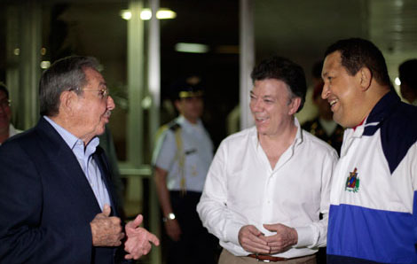 Ante la falta de consenso, Colombia no invitará a Cuba a la Cumbre de las Américas, pero buscará que en el foro se discuta el caso de la isla de manera constructiva, mientras La Habana evitará promover algún conflicto para la reunión o contra el gobierno de Bogotá. Es el acuerdo al que llegaron los presidentes Raúl Castro y Juan Manuel Santos, en cita en la capital del país caribeño. El mandatario colombiano también se entrevistó con su par venezolano Hugo Chávez, quien convalece de una operación de cáncer Foto Ap