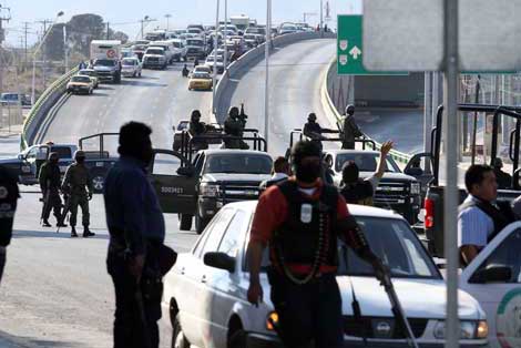 Una serie de balaceras ocurrieron en varias arterias de Saltillo –entre ellas el Periférico Luis Echeverría (imagen)–, cuando fuerzas policiacas y militares repelieron ataques de grupos del crimen organizado; el gobierno del estado reportó dos heridos de bala. En Piedras Negras también se informó de emboscadas y enfrentamientos, con saldo de una policía ultimada y cuatro agentes heridos Foto La Jornada