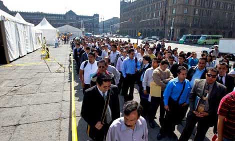 Cientos de personas acudieron al Zócalo capitalino en busca de una de las 12 mil vacantes que ofrecen 283 empresas e instituciones en la vigésima quinta edición de la Feria del Empleo. Desde temprana hora realizaron filas para la espera de un turno. Algunos de los participantes cayeron en el desánimo debido a los requisitos: ponen topes de edad, a los egresados de la universidad les exigen experiencia y los medios tiempos son de siete horas, dijeron. El gobierno capitalino expuso que tiene registros de 270 mil desempleados Foto Yazmín Ortega Cortés