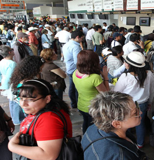 Miles de capitalinos aprovecharon el puente vacacional que termina el próximo lunes y abarrotaron las terminales de autobuses. El aeropuerto de la ciudad de México registró una elevada demanda de vuelos. En la imagen, la Central Camionera del Sur Foto Carlos Cisneros