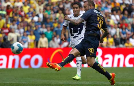 Las Águilas definieron el encuentro realizado en el estadio Azteca con goles de Christian Benítez, por la vía penal al minuto 9, así como del argentino naturalizado mexicano Matías Vuoso (imagen), al 86. Juan Carlos Cacho logró el empate momentáneo de los universitarios al 57. El técnico Miguel Herrera dijo que sus dirigidos tuvieron un juego irregular y que están en deuda. Con este resultado, el conjunto de Televisa llegó a 22 unidades y al cuarto sitio de la tabla general, en tanto el conjunto auriazul tiene 11 puntos Foto Cristina Rodríguez
