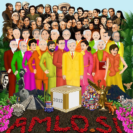Como una copia de la portada del disco Sgt. Pepper’s Lonely Hearts Club Band, de los Beatles, el portal AMLO.si publicó una caricatura del candidato presidencial Andrés Manuel López Obrador rodeado de los personajes que integrarían su gabinete en caso de ganar, así como de los padres de la patria