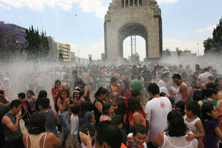 Para divertirse, cientos de capitalinos acudieron a celebrar el Sábado de Gloria en las fuentes de la explanada del Monumento a la Revolución. En otros puntos del Distrito Federal, 15 personas fueron detenidas por desperdiciar el agua potable Foto José Antonio López