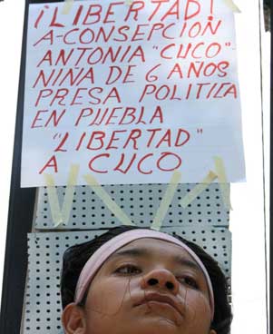 Antonia López se cosió los labios y se colgó de una cruz en las rejas del Senado para demandar que le sea entregada su hija Concepción Antonia Fernández López, de seis años, quien le fue quitada en Puebla, el 21 de marzo, por la coordinadora de Ministerios Públicos del estado, Leticia Villaraldo, para entregarla al DIF estatal. Su esposo, Antonio Fernández Sánchez, denunció que el hecho es una represalia porque mi esposa y yo defendemos a indígenas y campesinos de arbitrariedades oficiales Jesús Villaseca