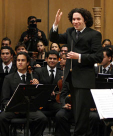 familia musical, como él la llama: la Filarmónica de Los Ángeles, de la que es director desde 2009, y la Sinfónica Simón Bolívar (antes Juvenil), de la que ha sido director musical desde 1999 y está formada por sus amigos y compañeros graduados de El Sistema, el notable programa nacional de educación musical de Venezuela.