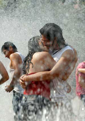 Citadinos se refrescan en las fuentes del Monumento a la Revolución. Las autoridades capitalinas alertaron que las elevadas temperaturas y radiación solar se mantendrán hasta junio, con riesgo de quemaduras si hay prolongada exposición Foto Yazmín Ortega Cortés