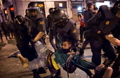 En la madrugada del domingo, la policía española desalojó a más de 500 indignados que permanecían en la madrileña Puerta del Sol, luego de la multitudinaria manifestación para conmemorar el primer aniversario de la movilización ciudadana contra el capitalismo salvaje y la crisis. Los agentes antidisturbios, sin identificaciones visibles y armados con rifles de balas de goma, toletes, gases lacrimógenos y escudos, realizaron la operación y detuvieron a 16 personas. También hubo represión en Valencia, Palma de Mallorca y Cádiz Foto Ap
