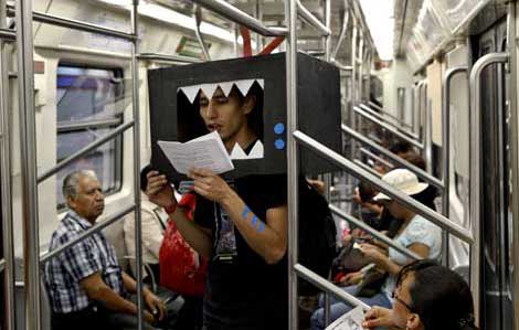 Integrantes del movimiento promueven en vagones del Metro el voto informado. Ayer, cientos de jóvenes se concentraron frente a Televisa Chapultepec y en uno de los muros, como si fuera un gran televisor, proyectaron imágenes para rememorar la matanza de Tlatelolco, el halconazo de 1971, Acteal, Aguas Blancas, Atenco y el más grande fraude electoral en la historia del país: 1988 Foto José Carlo González