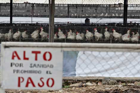 Cerco sanitario en una de las granjas avícolas afectadas por el virus de la influenza aviar en los municipios de Acatic y Tepatitlán, Jalisco. Las autoridades agropecuarias estiman que hay más de dos millones y medio de aves infectadas Foto Arturo Campos Cedillo