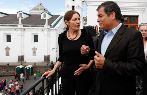 El presidente de Ecuador conversa con Christine Assange en un balcón del palacio de Corondelet, en Quito. La progenitora del creador de Wikileaks solicitó nuevamente al gobernante que conceda asilo político a su hijo, quien está refugiado en la embajada del país sudamericano en Londres desde el 19 de junio. Correa dijo que