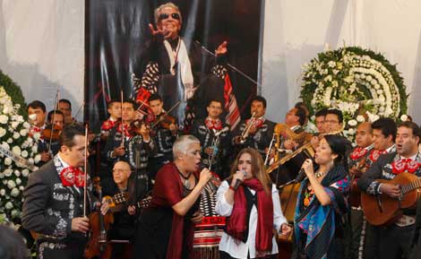 Eugenia León, Tania Libertad y Lila Dows interpretaron piezas representativas de La Macorina –quien murió el pasado domingo–, en el homenaje de cuerpo presente que organizaron el CNCA y el Gobierno del Distrito Federal en la popular plaza. Cientos de personas se congregaron en el lugar horas antes de que arribara el cortejo fúnebre, a las siete de la noche. La vox populi exclamaba: